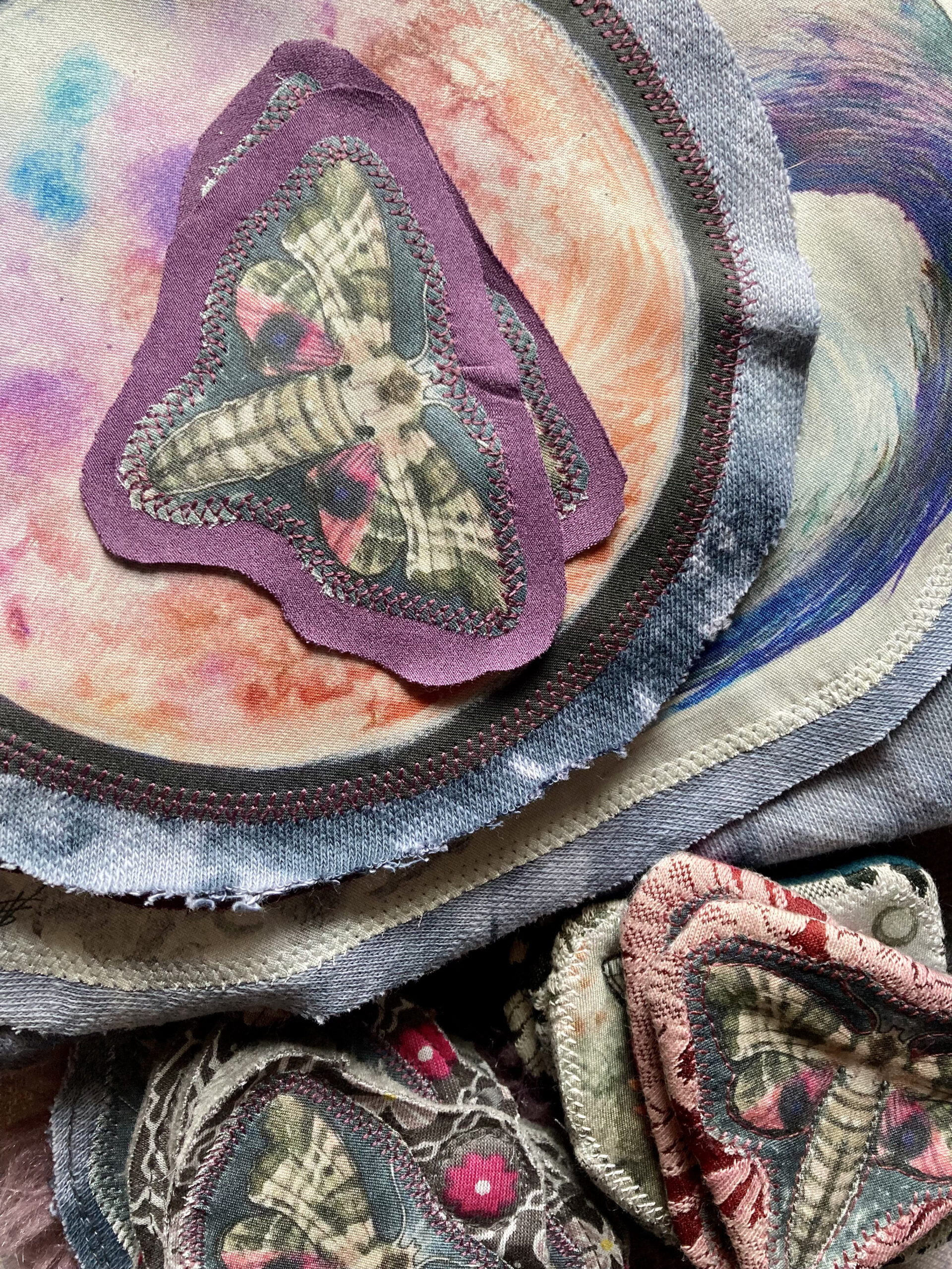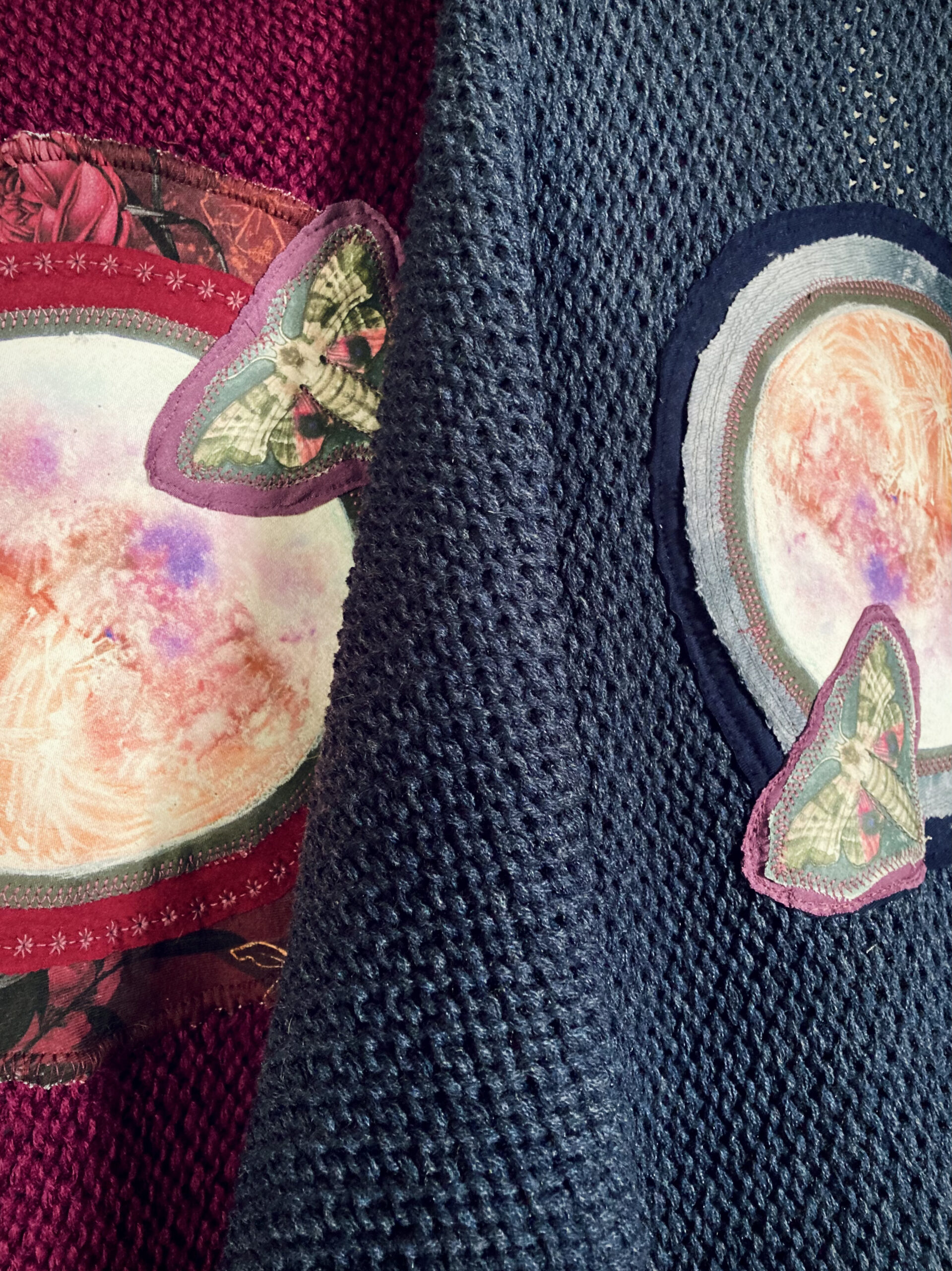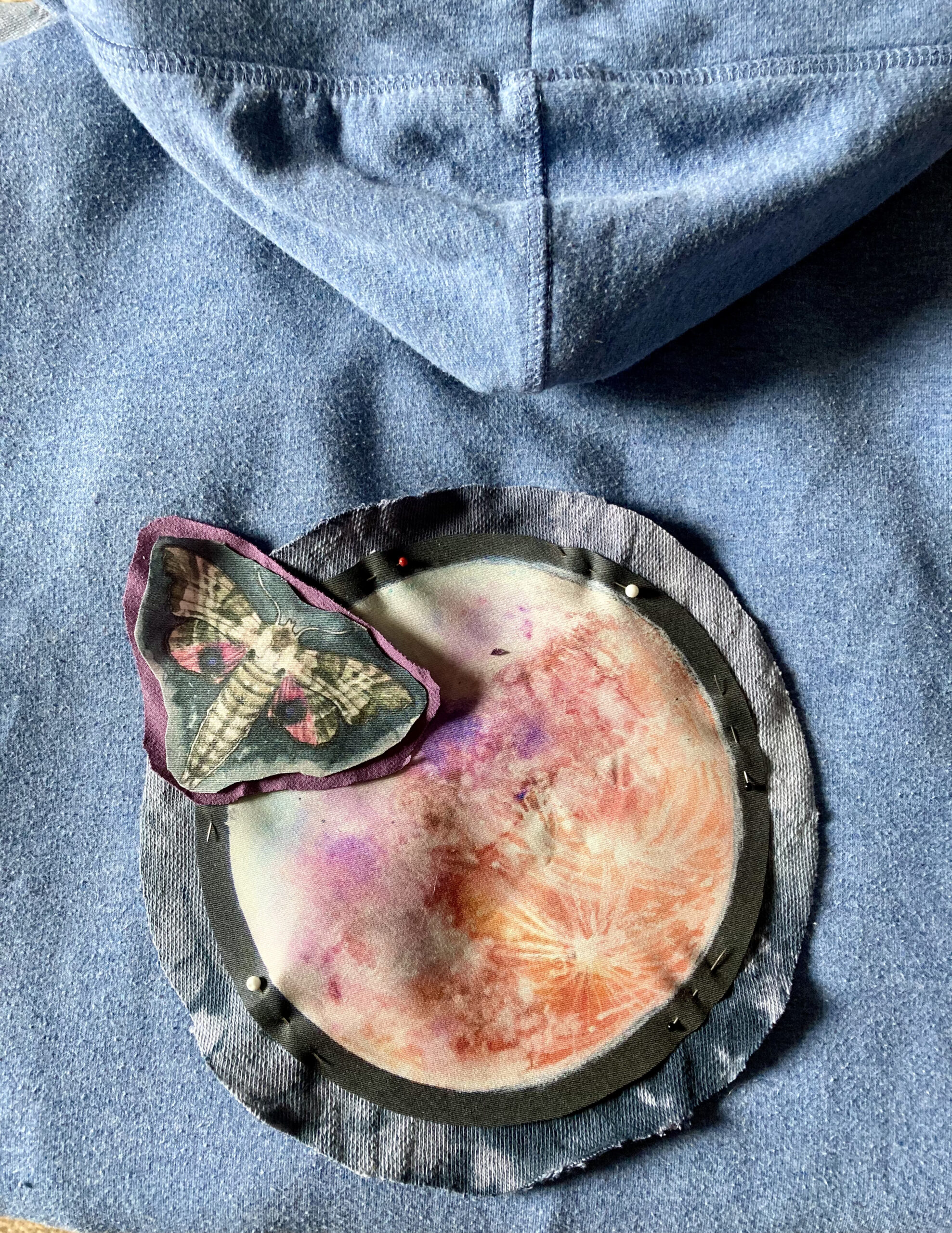 Na zádech autorské aplikace s úplňkem – tisk na látku podel vlastního akvarelu (doplňkové látky se mohou mírně lišit podle dostupnosti materiálu)