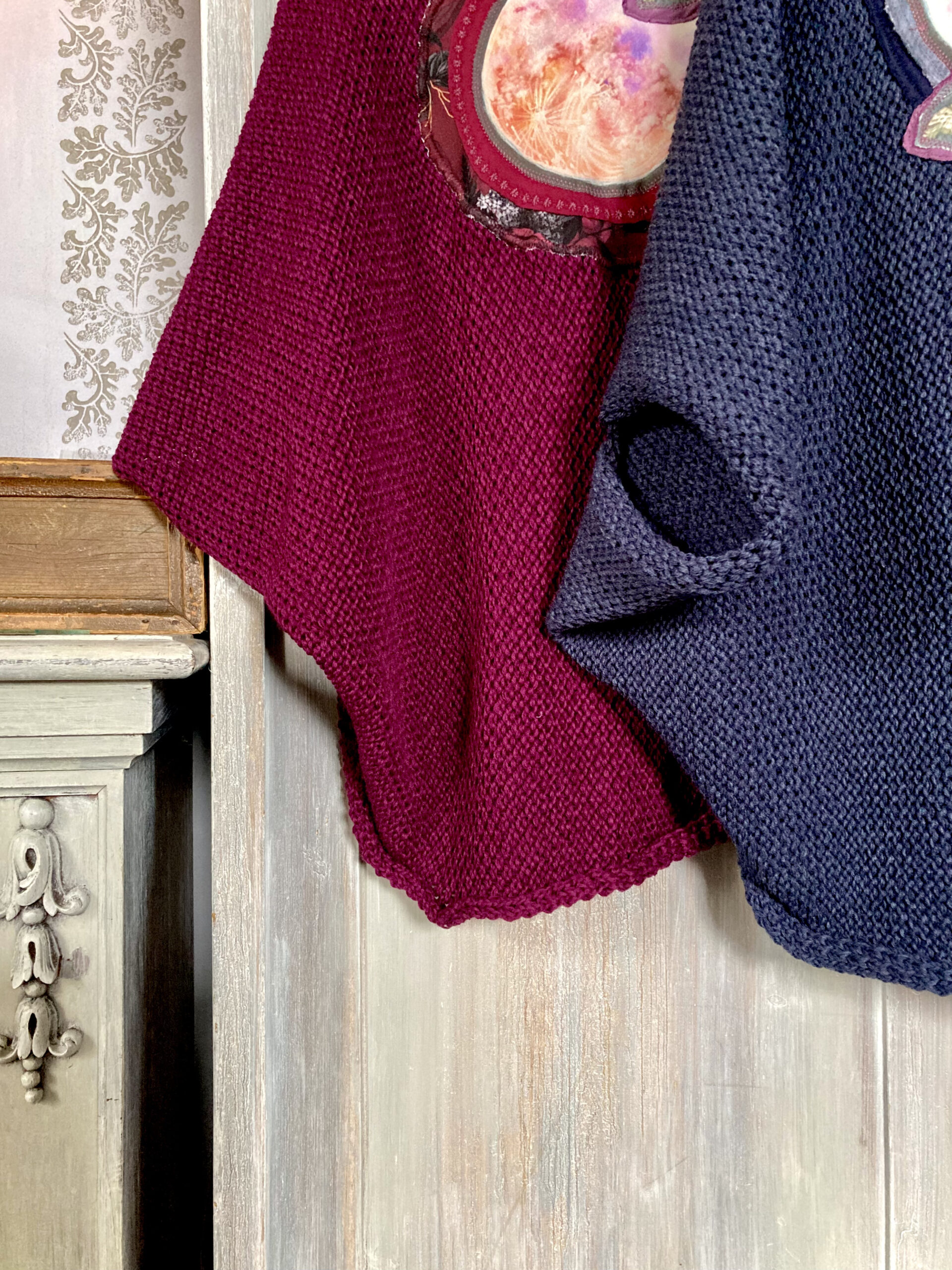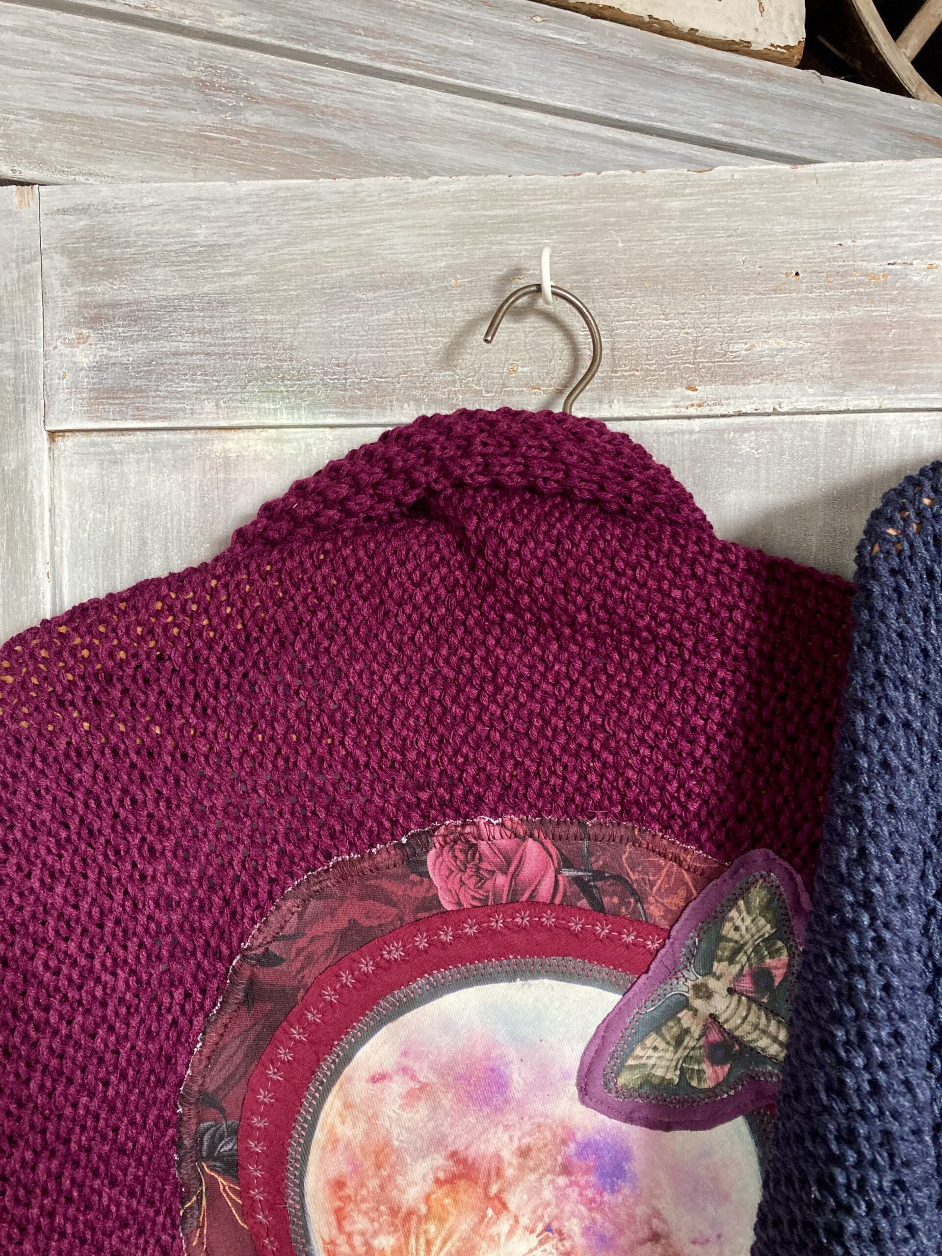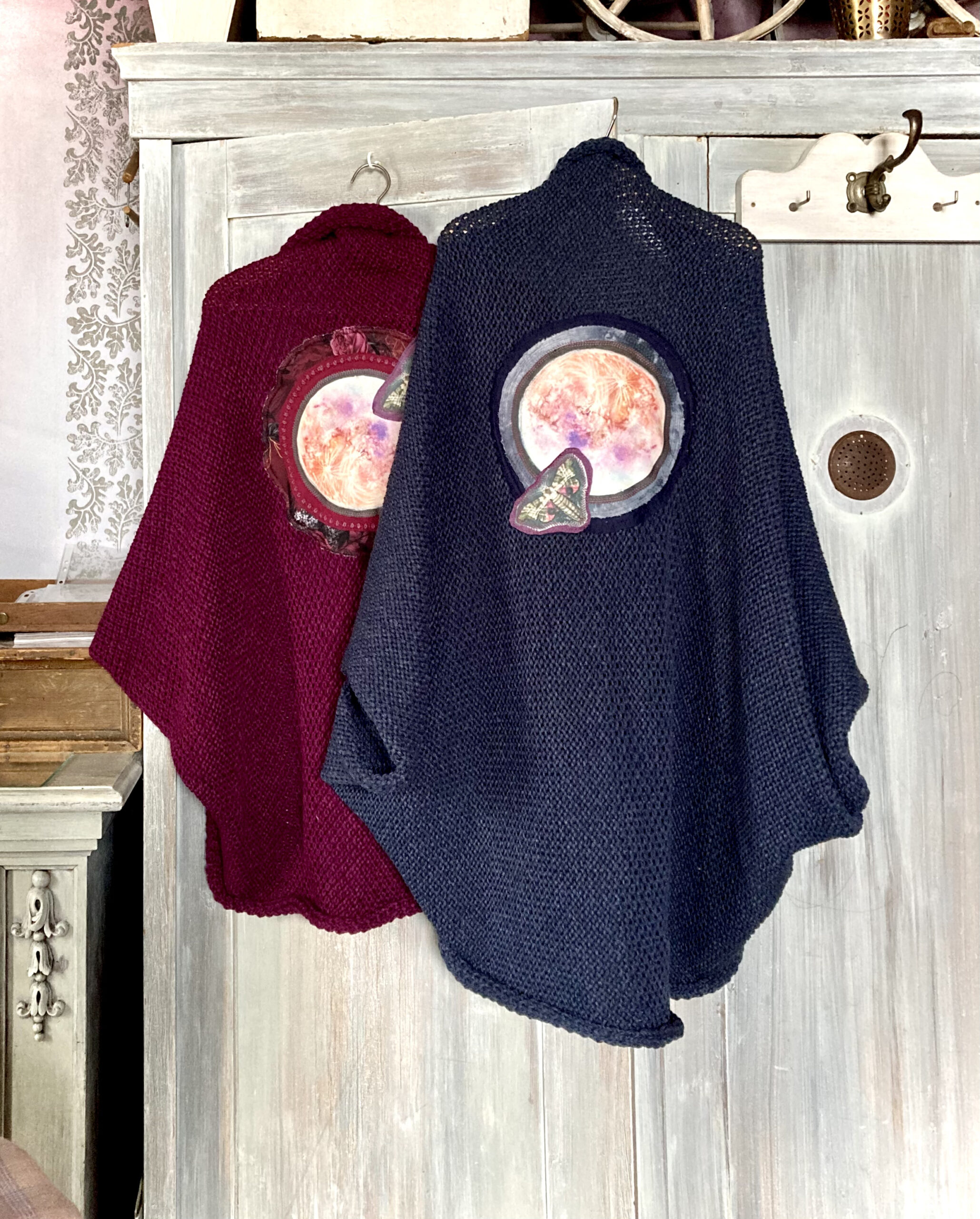 Na zádech autorské aplikace s úplňkem – tisk na látku podel vlastního akvarelu (doplňkové látky se mohou mírně lišit podle dostupnosti materiálu)